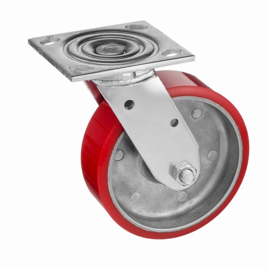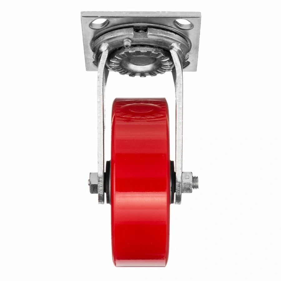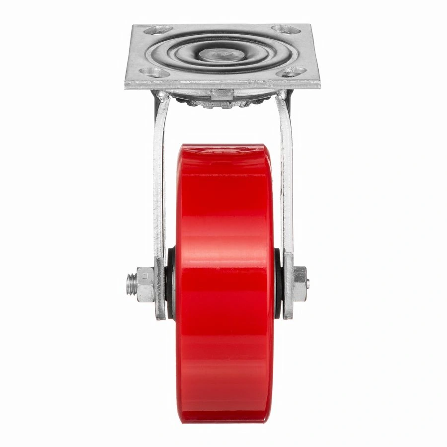 Колесо 1043-152, диаметр 152мм., чугун или полиуретан, поворотное, игольчатый подшипник. Грузоподъемность 360кг. Колесо полиуретановое, центр из литого чугуна. В оси колеса-игольчатый подшипник. Поворотный кронштейн имеет двурядный подшипник. Наличие масленки позволяет периодически обслуживать колесо. Крепление площадка под 4 болта. Колеса полиуретановые с чугунным сердечником широко применяются на бетонных полах преимущественно внутри помещений. Широко используются на тележках, строительных лесах и другом оборудовании, где требуется высокая грузоподъемность. при длительном нахождении под большой нагрузкой не деформируются. Возможно использование вне помещении на твердых покрытиях. Температура эксплуатации от -20 до +50С.