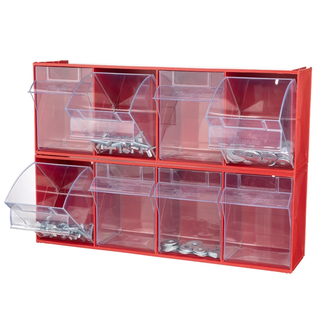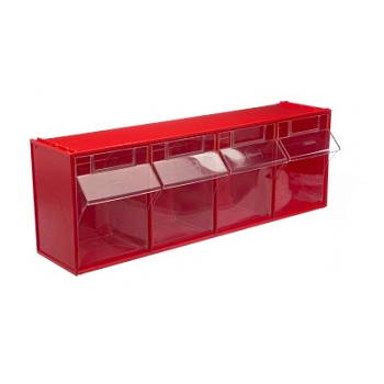 Короб откидной Стелла-техник F-600-4 (600х178х206мм.) 4 ячейки, красный, прозрачный служит для хранения мелкоштучных предметов. Данная система хранения не подвержена случайному опрокидыванию. Откидные стандартные ячейки обеспечивают быстрый доступ к необходимым предметам. В случае необходимости полного высыпания или наполнения внутренние ячейки легко извлекаются. Полезный внутренний размер каждой ячейки 138х127х134мм. Специальный пластик, из которого выполнен короб, выдерживает значительные нагрузки и обладает оптимальной эластичностью. На основе данных коробов можно сформировать многоярусную систему хранения вертикально, в том числе и с коробами меньших размеров, таких как F-600-9, F-600-6 и F-600-5 по принципу пирамиды. Использование в качестве дополнительного элемента специальных металлических рам, позволяет комплекту коробов нести большие нагрузки в напольном, настольном и настенном варианте. Короб данной модели легко можно прикрепить к стене или установить на специальные кронштейны (Артикул: Кронштейны-FOX-750). Обзорность содержимого сквозь прозрачные внутренние ячейки, наличие отсека для информационных бирок, легкое извлечение внутреннего короба для опустошения и наполнения, все это является неоспоримым преимуществом откидных коробов серии F. Температура эксплуатации от -10 до +70С.