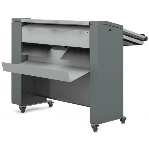 - Оснащен ручной подачей и корзиной для документов, выводящихся без фальцовки