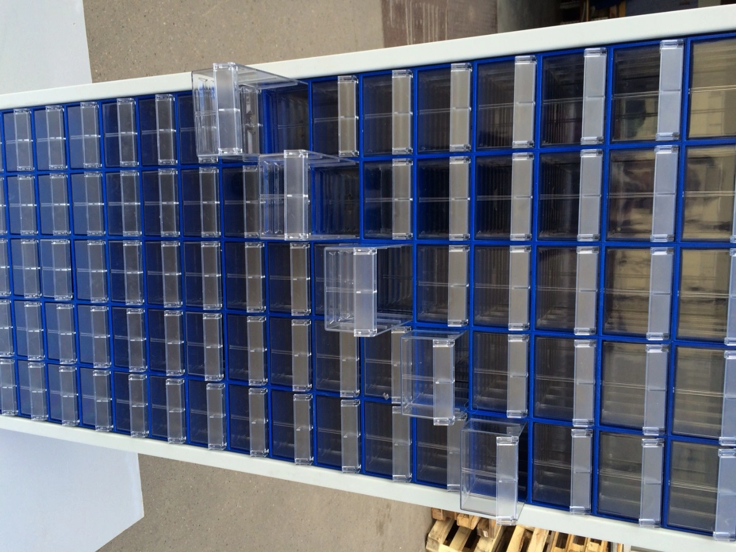 Шкаф металлический в сборе Стелла-техник С-2-90 на 90 коробов отлично впишется в интерьер любого склада, подсобного или торгового и офисного помещения. Цвет шкафа светло-серый. Цвет коробов С-2 синий, прозрачный. Металлический каркас шкафа востребован в первую очередь на предприятиях и организациях, где по определенным нормам и стандартам, принятом в данном учреждении, запрещено использование шкафа из ламинированного ДСП. Главная особенность шкафа – объединение большого количества коробов с определенным типовым размером. Изделие допускает одновременное применение 90 пластиковых складских контейнеров. Прозрачные внутренние короба С-2 позволяют легко находить содержимое и контролировать полноту наполнения. Внутренний короб легко вынимается для опустошения или наполнения, по принципу спичечного коробка. Он имеет рельефную структуру днища и усиленные толстые стенки. За счет этого, изделие справляются с высокими эксплуатационными нагрузками. Внутренние полезные размеры выдвижного короба: 220х123х80мм. Возможность установки одной продольной перегородки (артикул: С-2 продольная) или до трех поперечных (артикул: С-2 поперечная). Продольная и поперечная перегородки одновременно не устанавливаются. Перегородки в комплект короба не входят и поставляются отдельно. Рекомендуемая нагрузка на короб, в составе шкафа, не более 3кг.